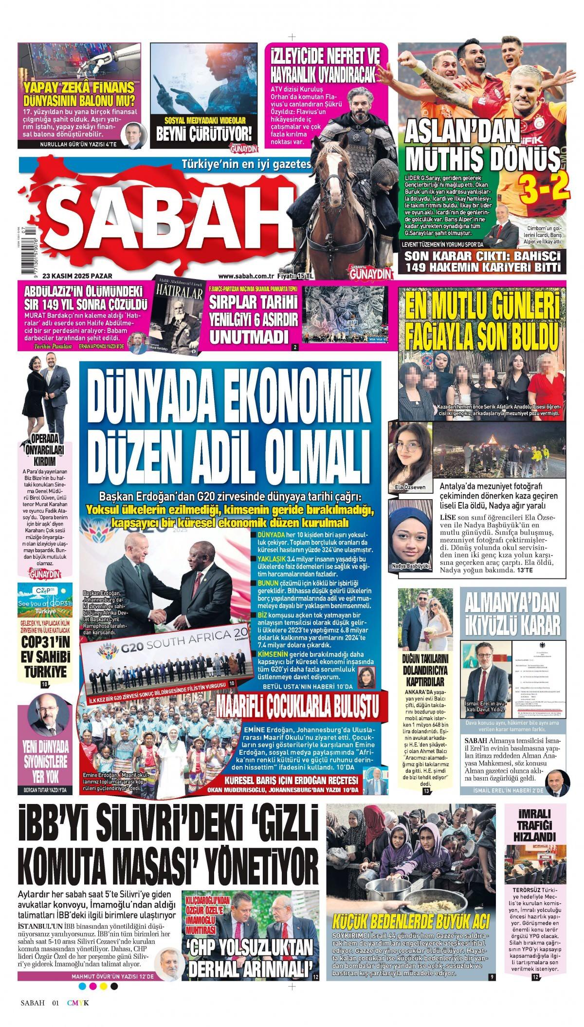 Sabah Gazetesi 23 Kasım 2025 Günü Manşeti