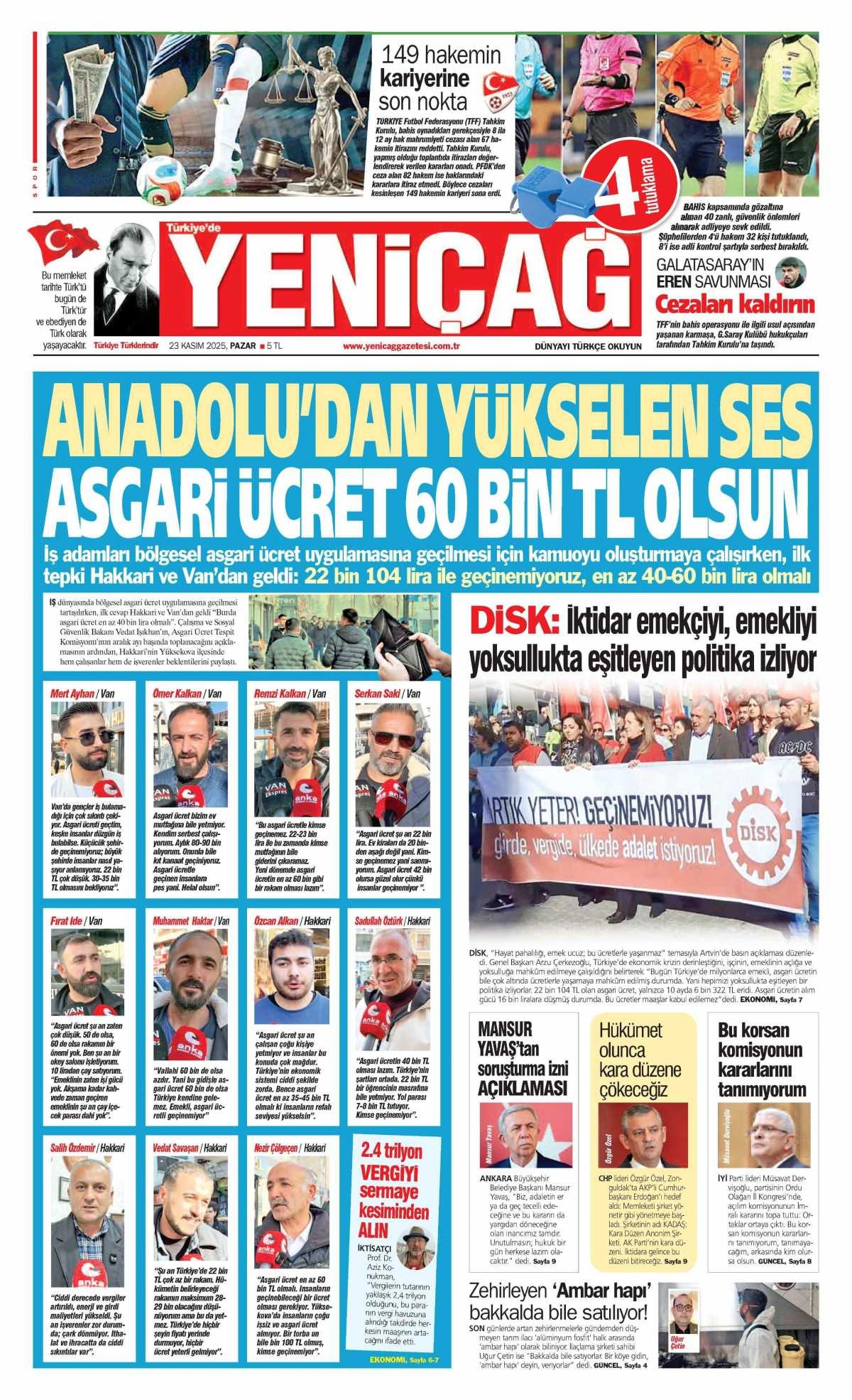 Yeni Çağ Gazetesi 23 Kasım 2025 Günü Manşeti